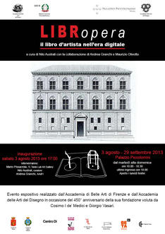 Questa esposizione, curata da Nilo Australi in collaborazione con Andrea Granchi e Maurizio Olivotto, pensata appositamente per il 450° della fondazione dell’Accademia delle Arti del Disegno, consente una ulteriore occasione di riflessione sulla produzione di opere in forma di “libro d’artista” qui esposte con una soluzione assai stimolante, quella cioè di presentare la recente produzione di un gruppo di artisti ormai affermati - che hanno svolto, o stanno ancora svolgendo, nel settore dell’Alta Formazione Artistica il ruolo di artisti-docenti - accanto a quella di giovani di eccellenza provenienti da tutte le parti del mondo, in un territorio in cui pittura, scultura, scrittura, fotografia e le più recenti tecniche digitali si intrecciano in un campo stimolante di lavoro. L’esposizione è legata alla produzione e alle iniziative del Laboratorio di Linguaggi Multimediali del Biennio specialistico in Arti Visive e Nuovi Linguaggi Espressivi tenuto a lungo da Andrea Granchi che ha promosso negli anni numerose esposizioni creando un indirizzo di ricerca nel campo dell’opera in forma di libro d’artista a cui, in questa occasione, si affiancano il Laboratorio di Grafica e Illustrazione di Maurizio Olivotto e, per la parte storica, il Centro Di casa editrice e centro di documentazione per le arti di Firenze e l’Archivio Venturino Venturi di Loro Ciuffenna.